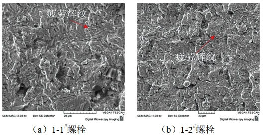 采用TESCAN VEGAⅡ掃描電子顯微鏡對(duì)斷口(圖 6)進(jìn)行分析,擴(kuò)展區(qū)較為整齊且有橫紋,瞬斷區(qū)出現(xiàn)小塊缺失,斷口呈典型疲勞斷裂特征。1-1#螺栓斷口源區(qū)為螺紋齒底位置,1-2#螺栓斷口源區(qū)內(nèi)存在多條棘輪花樣(圖 7)。兩個(gè)樣品的擴(kuò)展區(qū)均存在明顯的疲勞輝紋(圖 8)。