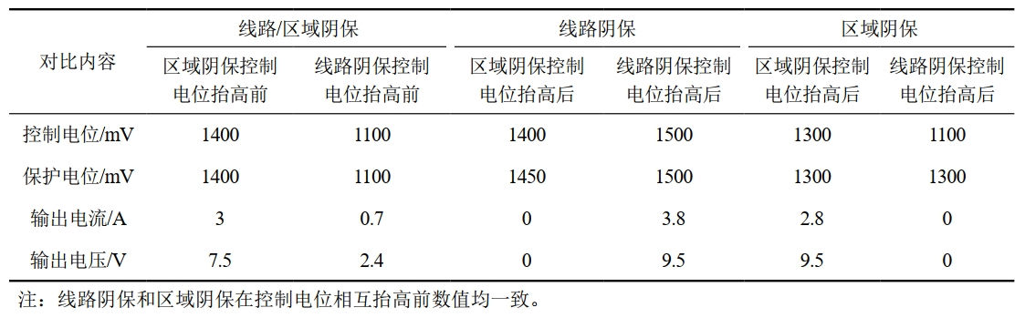 異,F(xiàn)象:區(qū)域陰保在恒電位運(yùn)行模式下,控制電位1100 mV提高至1300 mV,輸出電流0.7 A提高至2.8 A,輸出電壓9.5 V,線(xiàn)路陰保輸出電流降至0 A,自動(dòng)切換為恒電流運(yùn)行模式。線(xiàn)路陰保恒電位運(yùn)行模式,控制電位1300 mV提高至1500 mV,輸出電流3.8 A,輸出電壓9.5 V,區(qū)域陰保恒電位運(yùn)行模式故障狀態(tài),輸出電流0 A,自動(dòng)切換為恒電流運(yùn)行模式(表 2)。