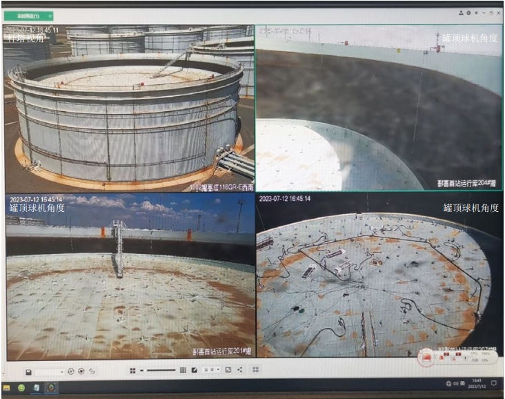 罐頂防爆高清一體化球機投用后,通過鏡頭旋轉,可對儲油罐浮頂進行無死角監(jiān)控,監(jiān)控圖像清晰,操作靈敏(圖 2)。項目投運也夯實了工業(yè)電視監(jiān)控系統(tǒng)與火災自動報警系統(tǒng)聯(lián)動的基礎,當報警發(fā)生時,能自動聯(lián)動控制相關的攝像機轉向報警區(qū)域,使站控調度工作人員第一時間掌握現(xiàn)場實際情況,確保第一時間發(fā)現(xiàn)安全隱患并處理。