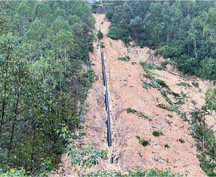 2023年9月6日18時(shí)43分,公司調(diào)控中心SCADA系統(tǒng)顯示揭陽站—梅州站閥室RTU網(wǎng)絡(luò)通信異常報(bào)警,管道運(yùn)行壓力正常。隨即汕頭作業(yè)區(qū)組織人員冒雨前往現(xiàn)場排查,排除了機(jī)械挖掘可能。因管道附近山路陡峭且周邊出現(xiàn)多處坍塌,且山溝水流急,夜間視線差,決定次日再排查。7日9時(shí)30分,經(jīng)現(xiàn)場確認(rèn)揭陽站至湯西閥室段發(fā)生坡面水毀,露管約70 m(圖 1),懸空約20 m,伴行光纜全部中斷。