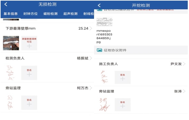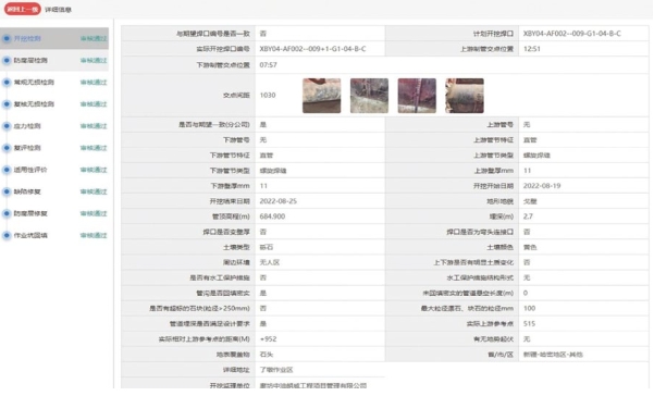 環(huán)焊縫開挖復(fù)檢管理APP將目標(biāo)焊口確認(rèn)、焊縫編號記錄、焊口錯邊情況、本體防腐層修復(fù)情況等作為關(guān)鍵質(zhì)量管控環(huán)節(jié),設(shè)計(jì)現(xiàn)場數(shù)據(jù)填報(bào)+拍攝照片(鏈接時(shí)間水印標(biāo)簽)、視頻等方式對環(huán)焊縫開挖復(fù)檢關(guān)鍵過程進(jìn)行定點(diǎn)記錄,確保關(guān)鍵環(huán)節(jié)和隱蔽工程施工記錄真實(shí)可靠。