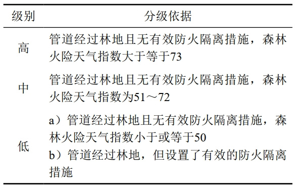 (2)山火易發(fā)性分級(jí)。根據(jù)全國(guó)森林火險(xiǎn)天氣等級(jí)行業(yè)標(biāo)準(zhǔn)規(guī)定的森林火險(xiǎn)天氣指數(shù)計(jì)算標(biāo)準(zhǔn),結(jié)合管道是否采取防火隔離措施,對(duì)山火易發(fā)性分為三級(jí)(表 1)。