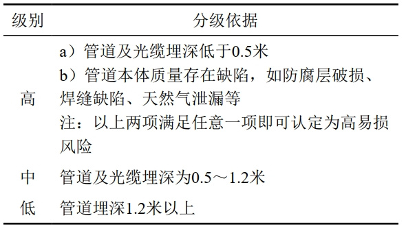 (3)管道易損性定性分級(jí)。根據(jù)數(shù)值模擬結(jié)論可知,山火對(duì)正常埋深且本體不存在質(zhì)量問題的管道、光纜基本沒有影響,山火對(duì)途經(jīng)管道的影響主要來(lái)源于埋深及管道自身缺陷兩個(gè)方面,以此對(duì)管道易損性分為三級(jí)(表 2)。