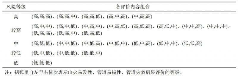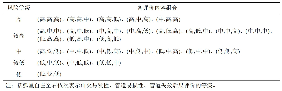(5)山火風(fēng)險(xiǎn)定性分級(jí)。綜合考慮山火易發(fā)性定性分級(jí)、管道易損性定性分級(jí)、管道高后果區(qū)定性分級(jí)結(jié)果,將天然氣管道山火風(fēng)險(xiǎn)分為五個(gè)等級(jí)(表 4)。
