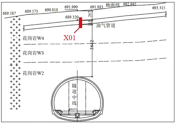 近年來(lái),山嶺鐵路隧道建設(shè)項(xiàng)目增多,隧道與在役管道交叉或并行情況時(shí)有發(fā)生。大部分山嶺鐵路隧道的掘進(jìn)施工以鉆爆法為主,其產(chǎn)生的瞬時(shí)沖擊波不可避免地對(duì)附近地下管道造成沖擊,會(huì)使管道承受較強(qiáng)激振作用而產(chǎn)生應(yīng)力損傷,當(dāng)振動(dòng)頻率等于管道固有頻率時(shí),會(huì)引起共振位移破壞[1-2]。為實(shí)時(shí)掌握在隧道鉆爆掘進(jìn)過程中管道周圍土體發(fā)生沉降、管道受力或沉降的情況,在管道與隧道交叉處布置應(yīng)力、位移和振動(dòng)等監(jiān)測(cè)裝置,實(shí)時(shí)監(jiān)測(cè)隧道施工過程中管道的應(yīng)力、振動(dòng)和位移,并對(duì)監(jiān)測(cè)數(shù)據(jù)進(jìn)行深入分析,可為隧道施工過程中的管道保護(hù)工作提供技術(shù)依據(jù)。