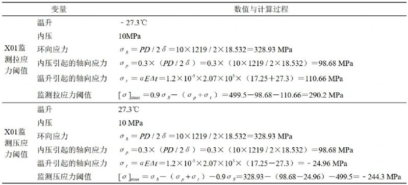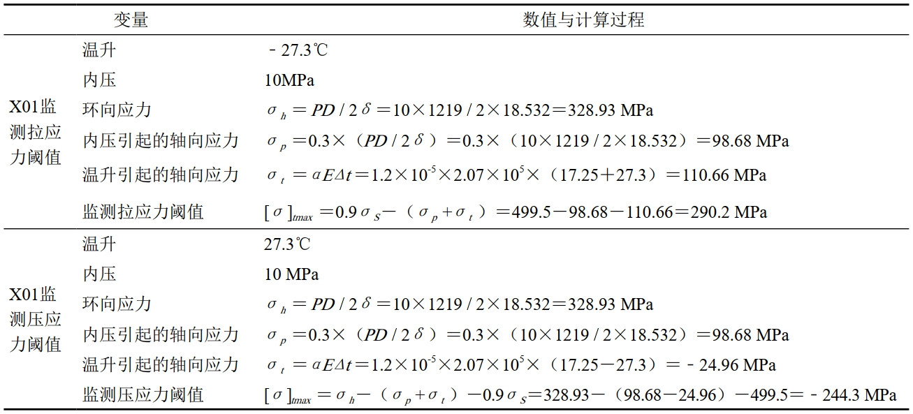 (1)管道監(jiān)測(cè)應(yīng)力閾值計(jì)算。依據(jù)GB 50251―2015《輸氣管道工程設(shè)計(jì)規(guī)范》,管道軸向應(yīng)力按式(1)計(jì)算: