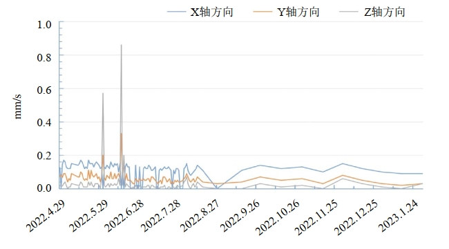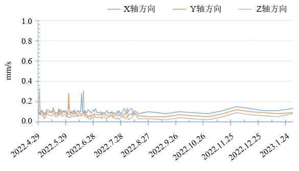 (4) 管道應(yīng)力監(jiān)測(cè)數(shù)據(jù)分析。施工后對(duì)管道應(yīng)力應(yīng)變、位移(沉降)、振動(dòng)實(shí)施9個(gè)月的現(xiàn)場(chǎng)監(jiān)測(cè)。應(yīng)力監(jiān)測(cè)時(shí)程曲線如圖 3,在整個(gè)監(jiān)測(cè)周期內(nèi),監(jiān)測(cè)截面管道附加應(yīng)力均處于較小值,最大拉應(yīng)力6.93 MPa,最大壓應(yīng)力﹣8.95 MPa,遠(yuǎn)未達(dá)到藍(lán)色預(yù)警值。累積沉降位移變化曲線如圖 4,當(dāng)前測(cè)點(diǎn)累積沉降位移值偏小,僅為﹣0.793 mm ,遠(yuǎn)小于安全閾值10 mm。2個(gè)監(jiān)測(cè)截面振動(dòng)速度隨時(shí)間變化曲線如圖 5、圖 6,各測(cè)點(diǎn)振動(dòng)速度值較小,均遠(yuǎn)小于安全閾值。其中,Z01測(cè)點(diǎn)沿Z軸方向振動(dòng)速度最大值為0.86 mm/s,Z02測(cè)點(diǎn)沿X軸方向振動(dòng)速度最大值為0.31 mm/s,均小于管道安全速度1.7 cm/s。