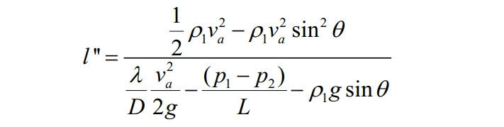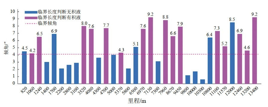 (1)評價方法優(yōu)化。本方法在NACE標準基礎上,針對臨界傾角法未考慮管道傾角處上坡段長度以及在地形平坦地區(qū)應用效果較差的問題,提出利用傾角處管道長度進一步判別該處是否可能積液。判別臨界長度之前的步驟與NACE標準步驟相同,在間接評價得到臨界傾角后,對每個大于臨界傾角的位置進行二次計算;贜ACE標準中臨界傾角的計算公式,經過改進后得到了本方法中臨界長度ι''的表達式: