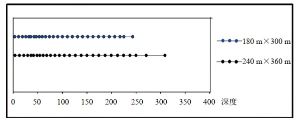 發(fā)射線框。線框邊長會直接影響勘探深度,在相同頻率下,線框邊長越大,探測深度越深。根據(jù)已知地質(zhì)資料可知,勘探區(qū)內(nèi)目的層埋深約250 m左右。發(fā)射線框為180 m×300 m和240 m×360 m時觀測得到的響應(yīng)曲線,當(dāng)發(fā)射線框尺寸為240 m×360 m時,在響應(yīng)曲線尾支更平滑。通過數(shù)據(jù)處理得到深度示意圖(圖 2),發(fā)射邊框180 m×300 m時,探測深度小于250 m;發(fā)射邊框為240 m×360 m時,能滿足探測深度,因此為了保證感應(yīng)場強度,故選用240 m×360 m發(fā)射邊框進行工作。