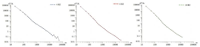 發(fā)射頻率。會影響探測深度,頻率越低,探測深度越深。4 Hz、8 Hz和16 Hz的響應(yīng)曲線(圖 3)中可以看到,4 Hz衰減曲線由于采樣周期較長,造成晚期出現(xiàn)隨機干擾,有效采樣道數(shù)變少,證明其頻率不適合本測區(qū)的電性反應(yīng)條件;8 Hz的衰減曲線比較圓滑,較晚的信號出現(xiàn)的波動干擾也較小,證明有效信號的總體衰減趨勢特征已經(jīng)被完整采集;16 Hz的衰減曲線更為圓滑,但其衰減曲線的采樣道數(shù)只有25道,總采樣道數(shù)比8 Hz頻率少3道,證明這個頻率的采樣周期完成后,有效衰減信號仍然還在延續(xù),說明只能采集到衰減信號的前部和中部,較晚的信號無法獲得,因此會丟失較深的地層信息。因此,確定選用既能夠?qū)⒂行У乃p信號采集完整,并且能夠保持較多的采樣道數(shù)的8 Hz進行數(shù)據(jù)采集。