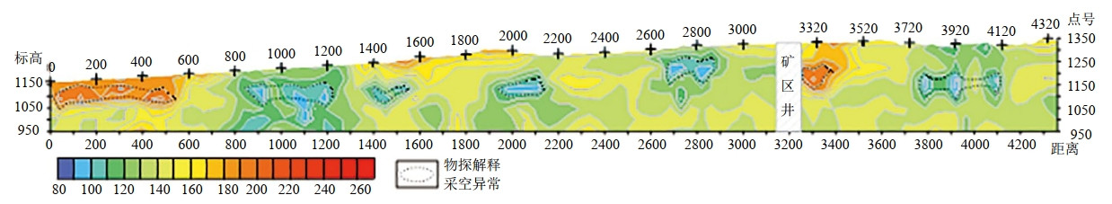 綜合已有地質(zhì)資料與物性資料對每條測線進行數(shù)據(jù)處理和解釋,現(xiàn)以L120測線為例進行解釋說明。L120測線瞬變電磁反演結(jié)果(圖 4)中,該測線探測范圍內(nèi)地下存在7處異常區(qū)。其中點號0 m~540 m發(fā)現(xiàn)相對高阻反應(yīng),根據(jù)異常所在標(biāo)高1050 m~1100 m處,結(jié)合資料分析推斷為新田煤礦5-1煤層采空,致使該處電阻率偏高于周圍巖性;在點號3260 m~3380 m發(fā)現(xiàn)相對高阻反應(yīng),根據(jù)異常所在標(biāo)高1200 m~1250 m處,結(jié)合資料推斷為西岔溝煤礦3-1煤層采空,致使該處電阻率偏高于周圍巖性;在點號800 m~1240 m、1400 m~1560 m、1960 m~2100 m發(fā)現(xiàn)相對低阻反應(yīng),根據(jù)異常所在標(biāo)高1050 m~1100 m處,結(jié)合資料分析推斷為新田煤礦5-1煤層圍巖富水或采空區(qū)局部含水引起;在點號2620 m~2860 m和3740 m~4100 m發(fā)現(xiàn)相對低阻反應(yīng),根據(jù)異常所在標(biāo)高1150 m~1250 m處,結(jié)合資料推斷為西岔溝煤礦3-1煤層采空充水或泥質(zhì)充填后所引起。