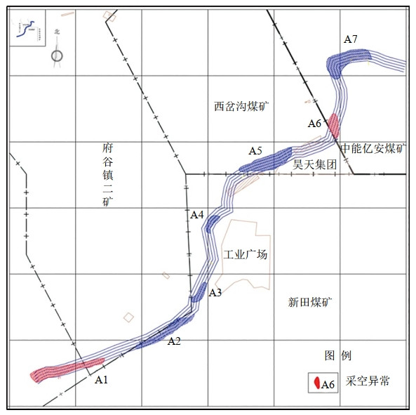 綜合勘查區(qū)5條瞬變電磁測線的解釋成果,根據(jù)點號將各測線異常展布在平面上,圈定了7處異常區(qū)。其中采空區(qū)4處,分別為A1、A5、A6、A7;圍巖富水或采空區(qū)局部含水3處,分別為A2、A3、A4(圖 5)。