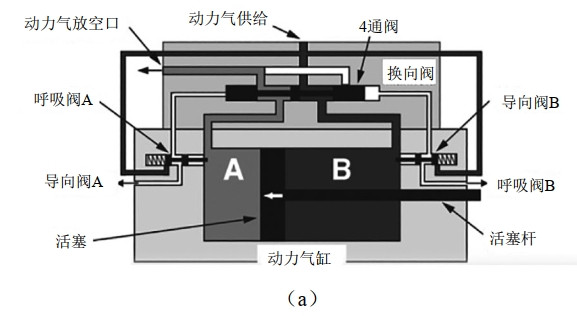 動力氣供給通過“4通閥”流道進入動力氣缸“B”腔,推動活塞往左運動(圖 1 a)。當活塞運動到左側極限時,活塞頂開“導向閥A”,使動力氣沿著“導向閥A”流道進入“4通閥”左側閥腔內(nèi),推動閥芯(黑色)向右運動,導通左側動力氣放空口,封閉右側動力氣進口,動力氣通過左側放空口泄放。