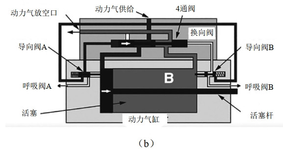 閥芯運動至右側極限時(圖 1 b),“4通閥”流道發(fā)生改變,動力氣供給通過“4通閥”流道進入動力氣缸“A”腔推動活塞往右運動。當活塞運動到右側極限時,活塞頂開“導向閥B” 使動力氣沿著“導向閥B”流道進入“4通閥”右側閥腔內(nèi)推動閥芯(黑色)向右運動,導通右側動力氣放空口,封閉左側動力氣進口,動力氣通過右側放空口泄放。
