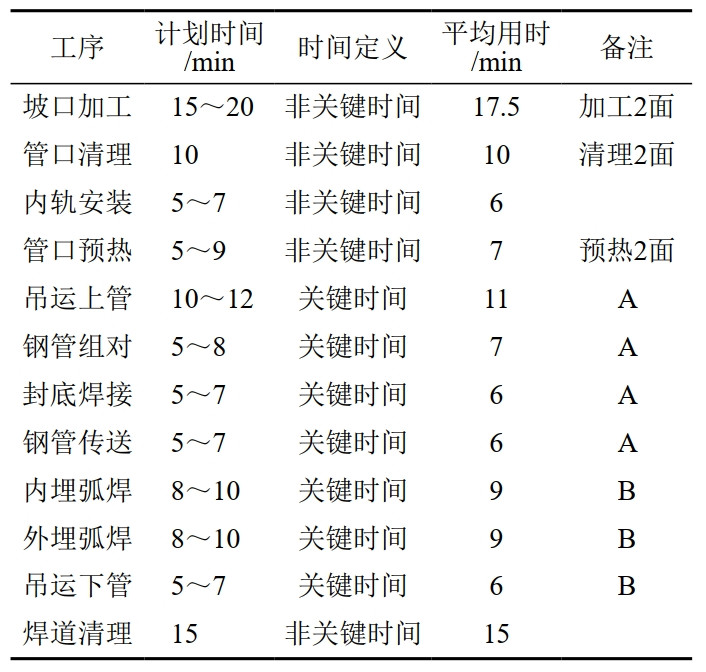現(xiàn)場(chǎng)移動(dòng)雙連管預(yù)制作業(yè)中,吊運(yùn)上管、鋼管組對(duì)、根焊、鋼管傳送為A關(guān)鍵時(shí)間單元,傳送時(shí)間為30分鐘;內(nèi)埋弧焊、外埋弧焊、吊運(yùn)下管為B關(guān)鍵時(shí)間單元(表 1),施工工效主要取決于A段時(shí)間環(huán)節(jié)。單日的預(yù)估工效:8 h×60 min÷30 min/道=16道焊口。預(yù)計(jì)綜合工效提高約50%,雙連管焊接合格率98.61%。