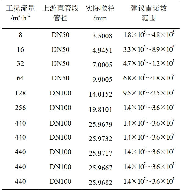 臨界流文丘里噴嘴標準裝置的設計工作壓力最大為10 MPa,工作條件下體積流量范圍為8 m³/h~ 2704 m³/h,由11路并聯(lián)安裝的臨界流文丘里噴嘴、壓力變送器、溫度變送器、色譜分析儀等組成。11支噴嘴在出廠之前經(jīng)過德國PTB進行了幾何檢定,其結(jié)果均符合ISO 9300加工的要求,喉徑范圍為3.5008 mm~25.9732 mm(表 1)。