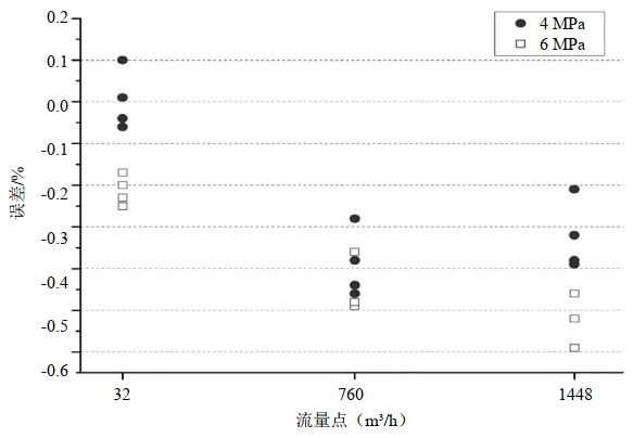 穩(wěn)定性實驗。選取DN80和DN250的渦輪流量計,選用音速噴嘴法氣體流量標準裝置進行測試。分別在4 MPa、6 MPa情況下對32 m³/h、760 m³/h、1448 m³/h進行實驗,結(jié)果表明裝置的穩(wěn)定性均≤0.22%(圖 1)。