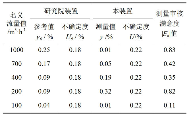 測量審核結(jié)果。為了驗證裝置的校準能力,選用一臺Elster型號為SM-RI-X G650的DN150渦輪流量計作為傳遞標準,在本音速噴嘴裝置及中國計量科學研究院的環(huán)道式氣體流量標準裝置上進行測量審核,滿意度按式(1)計算: