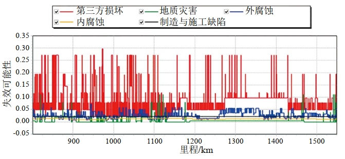 通過軟件可進一步對風險評價結(jié)果分類展開分析,分析第三方損壞、外腐蝕、內(nèi)腐蝕、制造與施工缺陷、地質(zhì)災害等不同類型的風險因素導致的失效可能性。