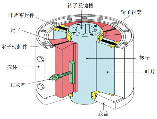 Shafer氣液聯(lián)動(dòng)執(zhí)行機(jī)構(gòu)的擺缸主要由轉(zhuǎn)子、葉片、葉片密封件、轉(zhuǎn)子襯套、定子、定子密封件、止動(dòng)棒、殼體、底蓋等組成(圖 1)。