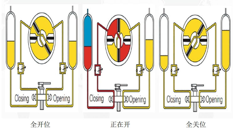 擺缸處于全開(kāi)位,液壓油無(wú)壓力,執(zhí)行器無(wú)旋轉(zhuǎn)動(dòng)作;執(zhí)行器順時(shí)針?lè)较蛐D(zhuǎn),高壓液體進(jìn)入關(guān)入口,壓力補(bǔ)償通道使得兩關(guān)閉腔體同步受壓,此時(shí),執(zhí)行器產(chǎn)生完全平衡的扭矩,推動(dòng)葉片轉(zhuǎn)動(dòng)。一旦執(zhí)行器到達(dá)全關(guān)位,液壓油壓力通過(guò)執(zhí)行器自身控制得到釋放(圖 2)。