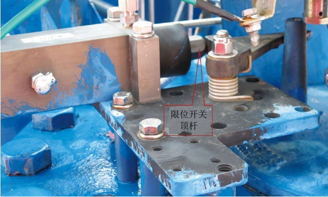 電磁閥、關(guān)位先導(dǎo)閥和限位開(kāi)關(guān)失效。以9870-S為例(圖 3),關(guān)位先導(dǎo)閥、關(guān)電磁閥、開(kāi)電磁閥存在內(nèi)漏,當(dāng)內(nèi)漏量大于提升閥內(nèi)部阻力孔的泄放量,提升閥的活塞會(huì)向左移動(dòng),閥桿頂開(kāi)錐形密封使高壓氣體進(jìn)入氣液罐內(nèi),液壓油在長(zhǎng)期壓力的作用下會(huì)竄至另外一個(gè)氣液罐內(nèi)。以10726-S為例(圖 4),限位開(kāi)關(guān)的頂桿行程過(guò)短也可能導(dǎo)致擺缸串油。當(dāng)ESD觸發(fā)后,高壓氣通過(guò)行程開(kāi)關(guān)實(shí)現(xiàn)自動(dòng)關(guān)閥。當(dāng)閥門(mén)關(guān)到位后,機(jī)械頂桿實(shí)現(xiàn)關(guān)氣路截?cái)。如果頂桿沒(méi)頂?shù)轿唬邏簹鈺?huì)持續(xù)作用于提升閥關(guān)路活塞,導(dǎo)致關(guān)閥動(dòng)作持續(xù),最終導(dǎo)致擺缸竄油。應(yīng)定期檢查遠(yuǎn)程開(kāi)、關(guān)電磁閥和關(guān)位先導(dǎo)閥的內(nèi)漏情況。在檢測(cè)時(shí)拆下遠(yuǎn)程開(kāi)、關(guān)電磁閥和關(guān)位先導(dǎo)閥出口引壓管連接卡套,緩慢對(duì)氣缸進(jìn)行充壓,同時(shí)用可燃?xì)怏w檢測(cè)儀對(duì)出口進(jìn)行持續(xù)檢測(cè),直至氣缸壓力達(dá)到日常運(yùn)行值。在整個(gè)充壓過(guò)程中,應(yīng)確保無(wú)氣體漏出,以驗(yàn)證遠(yuǎn)程開(kāi)、關(guān)電磁閥和關(guān)位先導(dǎo)閥無(wú)內(nèi)漏。若有內(nèi)漏現(xiàn)象,應(yīng)進(jìn)行更換。若10726-S限位開(kāi)關(guān)頂桿過(guò)短(圖 5),應(yīng)根據(jù)現(xiàn)場(chǎng)實(shí)際情況及時(shí)調(diào)節(jié)頂桿的長(zhǎng)度。在調(diào)節(jié)時(shí)注意控制頂桿的長(zhǎng)度,因?yàn)轫敆U過(guò)長(zhǎng)易損壞限位開(kāi)關(guān);頂桿過(guò)短將導(dǎo)致限位開(kāi)關(guān)的P口和C口不能有效截?cái),?zhí)行機(jī)構(gòu)將持續(xù)執(zhí)行關(guān)閥操作,從而引發(fā)串油和噴油故障。