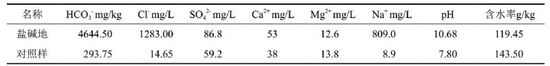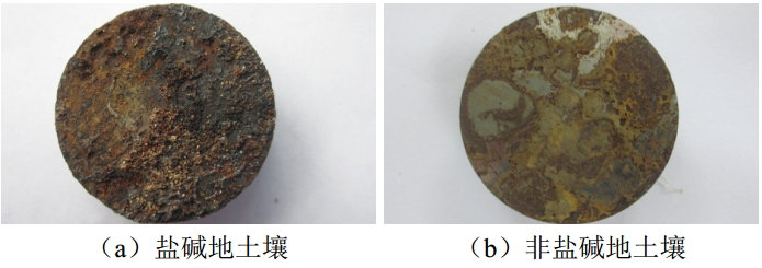 選用材質(zhì)為X65管線鋼,裸露面積為6.5 cm2的圓形試片, 其主要化學(xué)成分(質(zhì)量分?jǐn)?shù)%)為: C 0.03,Si 0.17,Mn 1.51,P 0.024,Ni 0.17,Cu 0.04,Mo 0.16等。取某鹽堿地現(xiàn)場土壤樣品,以北京市昌平區(qū)非鹽堿地土壤為對照試樣,于實驗室進行理化性能測試(表 1)。表明鹽堿地土樣的HCO3-、 Cl-、SO42-、pH明顯高于對照土樣;兩種土壤成分可以代表典型鹽堿地和非鹽堿地土壤條件。