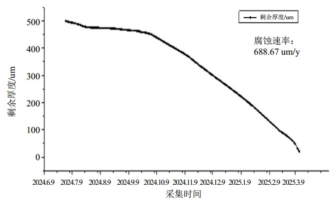 為進一步確定實際腐蝕情況,于2024年7月1日在鹽堿地現(xiàn)場埋設(shè)ER腐蝕速率探頭,至2025年3月13日,8個多月探頭壁厚由最初的499.06μm減薄至19.75μm,陰極保護管理平臺根據(jù)壁厚減薄自動折算的腐蝕速率為0.688 mm/y(圖 6),與實驗室采用失重法計算的0.578 mm/y相差0.110 mm/y,誤差為15.9%?紤]到現(xiàn)場實際的鹽堿地土壤環(huán)境,經(jīng)歷了大自然春夏秋冬和干濕交替,與實驗室的鹽堿地土樣條件及成分可能不完全一致,由此會呈現(xiàn)腐蝕速率偏差。但探頭壁厚減薄與試片失重兩者均表明鹽堿地對金屬的腐蝕性較強,若埋地金屬管道沒有采取合理的防護措施,以大于0.5 mm/y的腐蝕速率計,在管道的設(shè)計壽命內(nèi),鹽堿地土壤會大大加速管道腐蝕泄漏風(fēng)險。