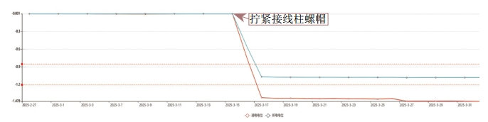 (2)接線松動或虛接,F(xiàn)場發(fā)現(xiàn)接線板接線柱螺帽未擰緊,松動約2~3圈,致使設(shè)備采集信號丟失或數(shù)據(jù)異常(圖 4)。還有管道連接線接線松動(虛接),導(dǎo)致采集的通電電位、交流電壓信號異常(圖 5),無法真實(shí)反映管道陰保運(yùn)行狀態(tài)。