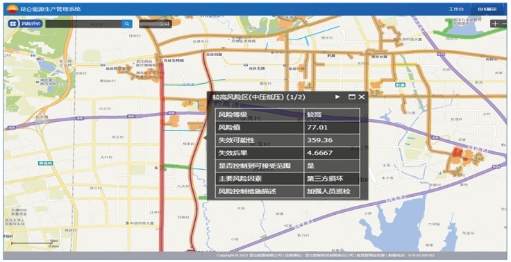 (3)風(fēng)險(xiǎn)評(píng)價(jià)與隱患識(shí)別。主要采用半定量評(píng)價(jià)標(biāo)準(zhǔn)開(kāi)展風(fēng)險(xiǎn)評(píng)價(jià),根據(jù)所選管段屬性和周邊環(huán)境情況,將管段劃分為不同單元,結(jié)合對(duì)應(yīng)的風(fēng)險(xiǎn)評(píng)價(jià)指標(biāo)進(jìn)行打分,依據(jù)風(fēng)險(xiǎn)評(píng)分計(jì)算模型得出各單元管段相對(duì)風(fēng)險(xiǎn)值。通過(guò)在系統(tǒng)內(nèi)建立風(fēng)險(xiǎn)評(píng)價(jià)模型,實(shí)現(xiàn)逐條管線在線精準(zhǔn)評(píng)價(jià)(圖 3),使以往操作復(fù)雜的風(fēng)險(xiǎn)評(píng)價(jià)方法得以在線大量實(shí)踐應(yīng)用,在系統(tǒng)內(nèi)生成快捷、便利的自動(dòng)測(cè)評(píng)結(jié)果展示。評(píng)價(jià)完成后GIS地圖直觀生成全公司風(fēng)險(xiǎn)展示圖(圖 4)。同時(shí)總結(jié)梳理管道典型隱患/失效類型,制定隱患分級(jí)判定企業(yè)標(biāo)準(zhǔn),推動(dòng)風(fēng)險(xiǎn)隱患科學(xué)識(shí)別,并開(kāi)發(fā)系統(tǒng)模型實(shí)施線上評(píng)價(jià)。