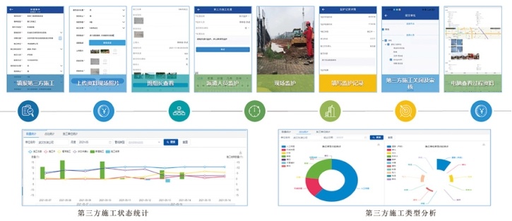 (6)維修與維護(hù)。針對(duì)可能造成嚴(yán)重后果的第三方損壞、地質(zhì)災(zāi)害、腐蝕等風(fēng)險(xiǎn),采取多種手段實(shí)施管控(圖 5、圖 6),并在系統(tǒng)內(nèi)實(shí)現(xiàn)全程監(jiān)控。一是對(duì)高風(fēng)險(xiǎn)管道閥井、周邊密閉空間、調(diào)壓箱(柜)等重點(diǎn)區(qū)域加裝無(wú)線可燃?xì)怏w泄漏監(jiān)測(cè)及地災(zāi)、水位、智能陰保和壓力監(jiān)測(cè)設(shè)備,并接入系統(tǒng)監(jiān)測(cè)。二是第三方施工監(jiān)護(hù)實(shí)施分級(jí)管理,采用“人工監(jiān)護(hù)+設(shè)置臨時(shí)視頻監(jiān)控”,自發(fā)現(xiàn)施工事件至施工結(jié)束、現(xiàn)場(chǎng)驗(yàn)收,通過(guò)系統(tǒng)實(shí)現(xiàn)閉環(huán)管理。三是對(duì)管道定檢、內(nèi)外檢測(cè)發(fā)現(xiàn)的問(wèn)題形成系統(tǒng)數(shù)據(jù),通過(guò)錄入管道缺陷信息、維修記錄,及時(shí)掌握管道缺陷變化情況,形成多輪檢測(cè)數(shù)據(jù)對(duì)齊。四是為預(yù)防各類失效風(fēng)險(xiǎn)編制現(xiàn)場(chǎng)處置預(yù)案,設(shè)置區(qū)域關(guān)閥分析、應(yīng)急資源查詢等功能,開(kāi)展應(yīng)急處置演練。