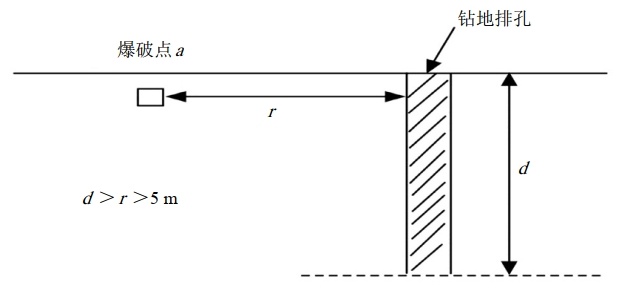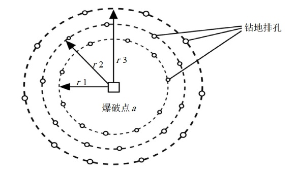 (2)實(shí)施方法。在距離爆破點(diǎn)一定半徑的軌跡上,按照一定間距和密度對(duì)地打孔,以及變化半徑多層次錯(cuò)位打孔,類(lèi)似于豎井作業(yè)過(guò)程中的圍幕注漿法。根據(jù)現(xiàn)場(chǎng)條件和保護(hù)要求,可以采取全環(huán)打孔或局部方向弧線打孔(圖 1)。