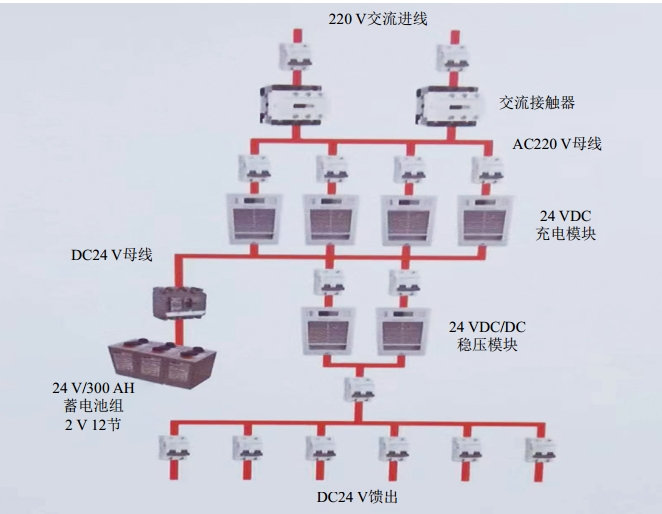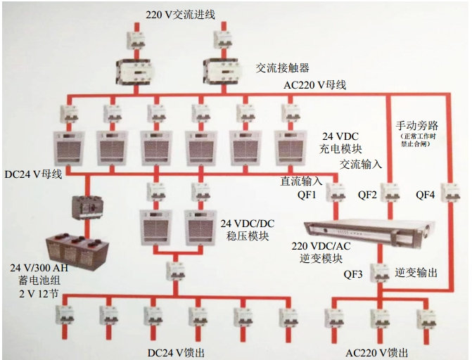 直流電源1所供負(fù)載為通信設(shè)備及攝像頭,6路充電模塊并聯(lián)運(yùn)行,互為備用,支持熱插拔。并配置雙電源逆變器一臺(tái),用于給使用220 V交流電壓的設(shè)備供電,該逆變器在有市電時(shí)使用市電工作,當(dāng)市電中斷時(shí)自動(dòng)切換為使用蓄電池組提供的24 V直流電源工作,需要檢修時(shí)可以使用手動(dòng)旁路開關(guān),將逆變器拆除進(jìn)行維修;直流電源2所供負(fù)載為自動(dòng)化設(shè)備,全部使用24 V直流電源工作,4路充電模塊并聯(lián)運(yùn)行,互為備用,支持熱插拔。