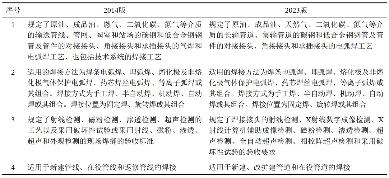 相對于2014版,2023版適用的管道介質(zhì)范圍有所縮小,輸送介質(zhì)將原“燃氣”修改為“天然氣”,排除了氫氣等其他燃氣。檢測方法增加了X射線數(shù)字成像檢測、X射線計算機輔助成像檢測、全自動超聲檢測、相控陣超聲檢測等數(shù)字化無損檢測方法,適應當前油氣管道建設(shè)數(shù)字化交付的需求。適用的管道類型為長輸管道和集輸管道,刪除了閥室和站場的工藝管道。增加了改擴建管道,刪除了返修管線。在附錄B中針對在役管道焊接給出了清晰的界限,即含有輸送介質(zhì)的帶壓或不帶壓、流動或不流動的管道系統(tǒng),在該管道系統(tǒng)中與外管壁直接接觸、熔合的焊接操作。