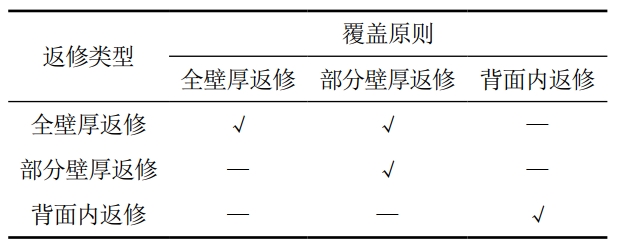 2023版規(guī)定了二次返修需單獨進行焊接工藝評定,還規(guī)定了全壁厚返修、部分壁厚返修和背面內(nèi)返修三種返修類型,以及不同返修類型的覆蓋規(guī)則,如表 5所示。
