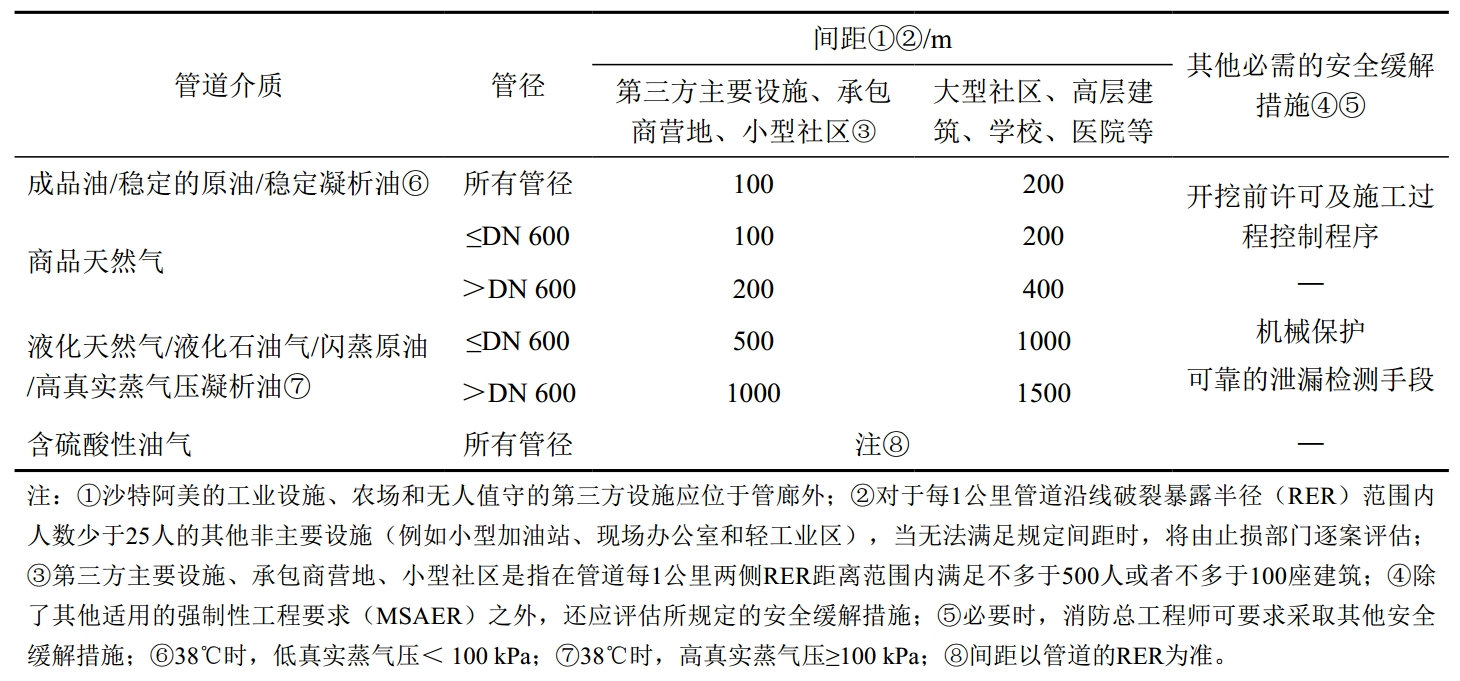 對(duì)于管道與居民社區(qū)、商業(yè)區(qū)、工業(yè)區(qū)、辦公區(qū)、學(xué)校醫(yī)院及大型活動(dòng)場(chǎng)館等建構(gòu)筑物和設(shè)施的間距,根據(jù)不同地區(qū)等級(jí)及建構(gòu)筑物規(guī)模等在安全設(shè)計(jì)專(zhuān)篇規(guī)范中作出明確間距要求及列明間距表,或給出可直接引用的簡(jiǎn)易計(jì)算公式,方便指導(dǎo)管道設(shè)計(jì)及項(xiàng)目驗(yàn)收工作。