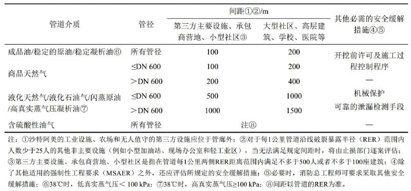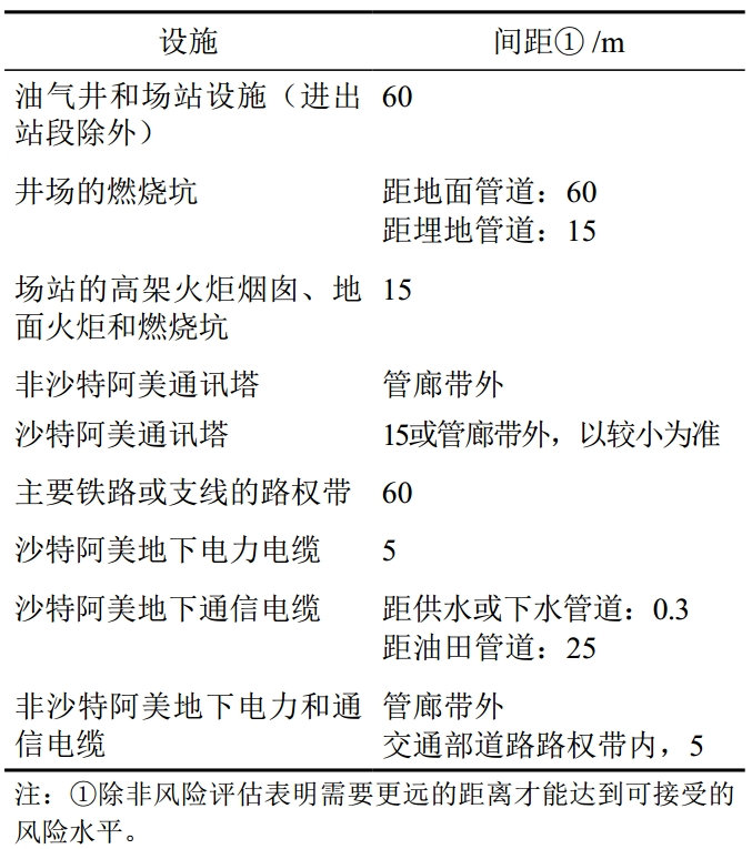 管道及電力線(xiàn)、通信線(xiàn)作為線(xiàn)性工程有共同的特點(diǎn),在野外多沿公路敷設(shè),在城郊鋪設(shè)在經(jīng)過(guò)規(guī)劃的廊帶。新建油氣管道多數(shù)會(huì)并行或交叉穿越這些服務(wù)設(shè)施,因此與這些設(shè)施的間距要求也是各類(lèi)規(guī)范的關(guān)注重點(diǎn)。沙特阿美SAES-B-064作為管道設(shè)計(jì)及施工的安全專(zhuān)篇規(guī)范,匯總規(guī)定了關(guān)于油氣管道與不同設(shè)施的間距要求,有利于設(shè)計(jì)及施工技術(shù)人員集中參考。