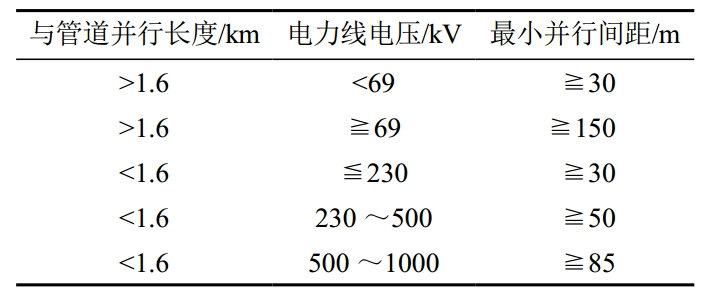 2)管道與架空通信線(xiàn)纜的間距要求:管道與已建架空通信桿、電纜之間的最小水平間距為15 m,最小垂直凈間距為9.0 m(從地面測(cè)量)。