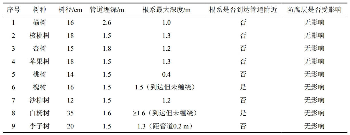 甘肅地區(qū)油氣管道主要穿越黃土高原半濕潤或半干旱區(qū)、河西走廊干旱區(qū)等地質(zhì),受降水量少、土壤容重大等自然條件限制,深根植物以中小喬木及灌木為主(如青楊、國槐、沙棗等),大型喬木分布極少。分公司通過分層開挖驗(yàn)證了9種樹種根系分布情況(表 1)。