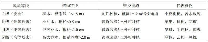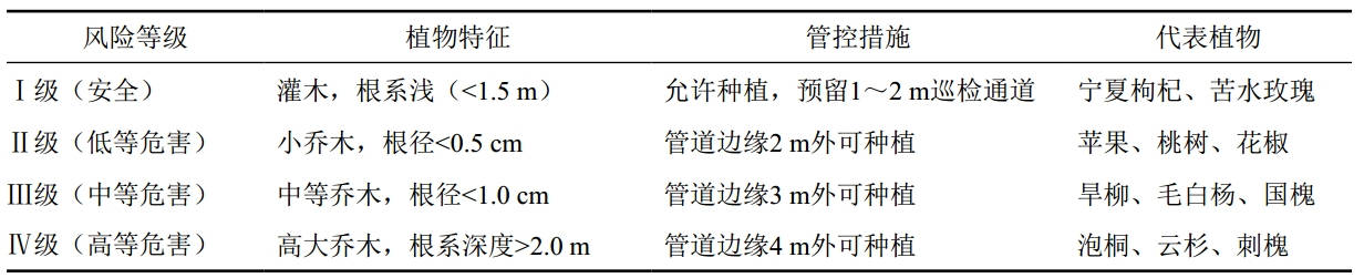 基于此,分公司根據(jù)國家管網(wǎng)集團(tuán)發(fā)布的《油氣長輸管道占壓分類分級管理工作指導(dǎo)意見》以及GB/T 23257―2017技術(shù)標(biāo)準(zhǔn),結(jié)合相關(guān)研究結(jié)果和開挖驗(yàn)證實(shí)際案例,以合理利用土地、維護(hù)管道沿線相關(guān)方利益為原則,針對地表植物的種類、種植年限、種植數(shù)量及3PE防腐層類型等情況,綜合分析確定安全風(fēng)險等級后,采取不同的管控措施(表 2),解決深根植物與管道間距不足的問題。